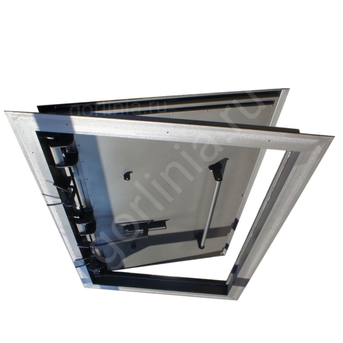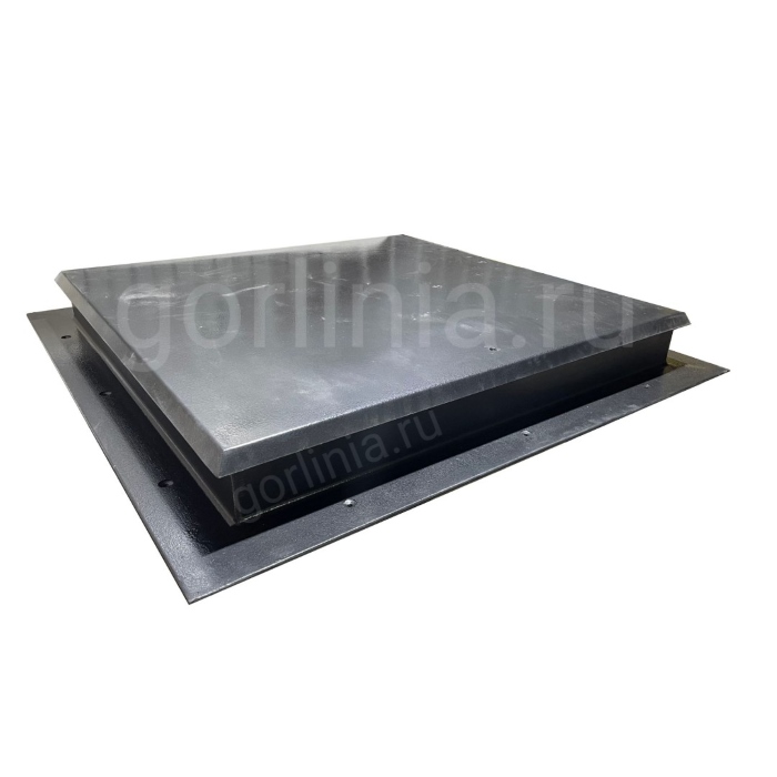 Откидная прямоугольная крышка заполнена сверху гладким кровельным листом 2 мм с загнутыми книзу краями, вылетающими на 25 мм за периметр внешней стенки. Внутри каркаса створки между ребрами обвязки проложен рулонный минеральный утеплитель 50 мм, подшитый снизу листовой сталью 1 мм.