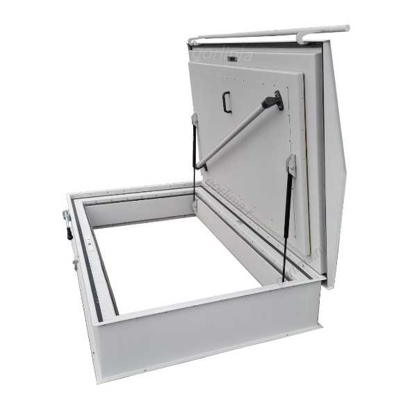 Продукция оснащается подъемным механизмом на петле с газовыми пружинами для снятия нагрузки, задвижкой и ручкой открывания с верхней стороны после выполнения работ на плоской кровле. В базовой комплектации встроен дверной ригельный замок с двумя личинками. Поручень служит опорой при движении по лестнице - по умолчанию ставится справа если смотреть на люк со стороны замка.