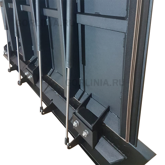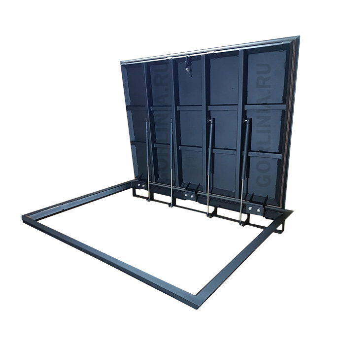 Подъемный механизм реализован на съемных петлях со вспомогательными газлифтами, замка собственной разработки. Разборную дверь удобно монтировать в напольный проем.
